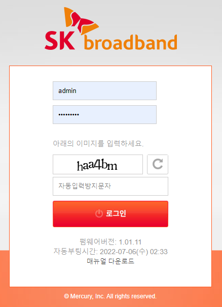 SKT공유기의 경우 브라우저에서 "192.168.45.1"를 입력하여 관리 페이지에 접속한다.