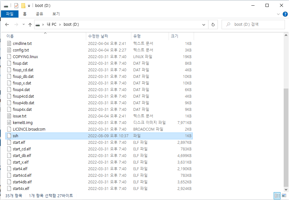 그래서, ssh 기능이 활성화될 수 있도록 image에 ssh라는 파일을 만들어 준다.