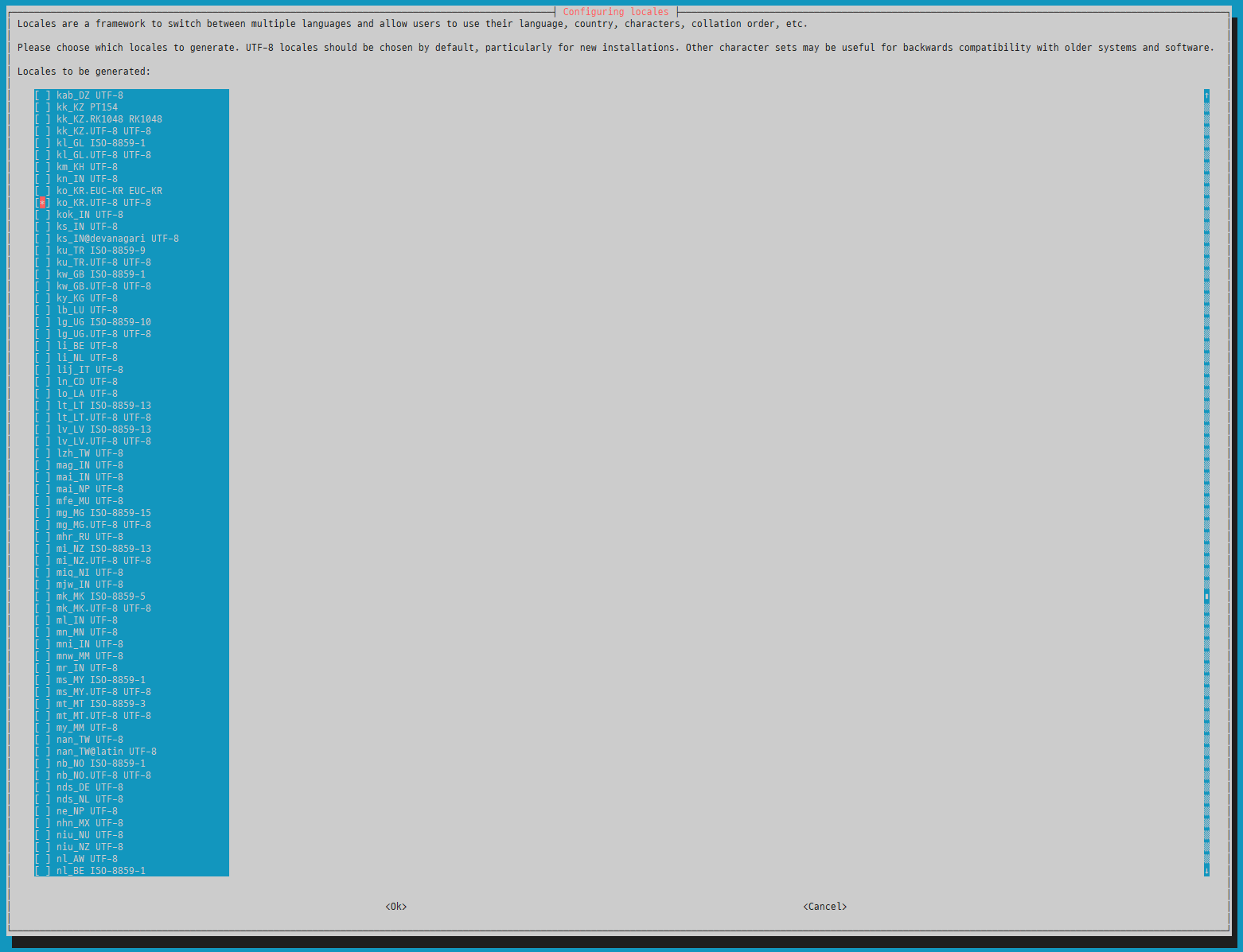 스페이스바를 이용해서 en_en_GB.UTF-8 UTF-8 , en_US.UTF-8 UTF-8 , ko_kr.UTF-8 UTF 선택