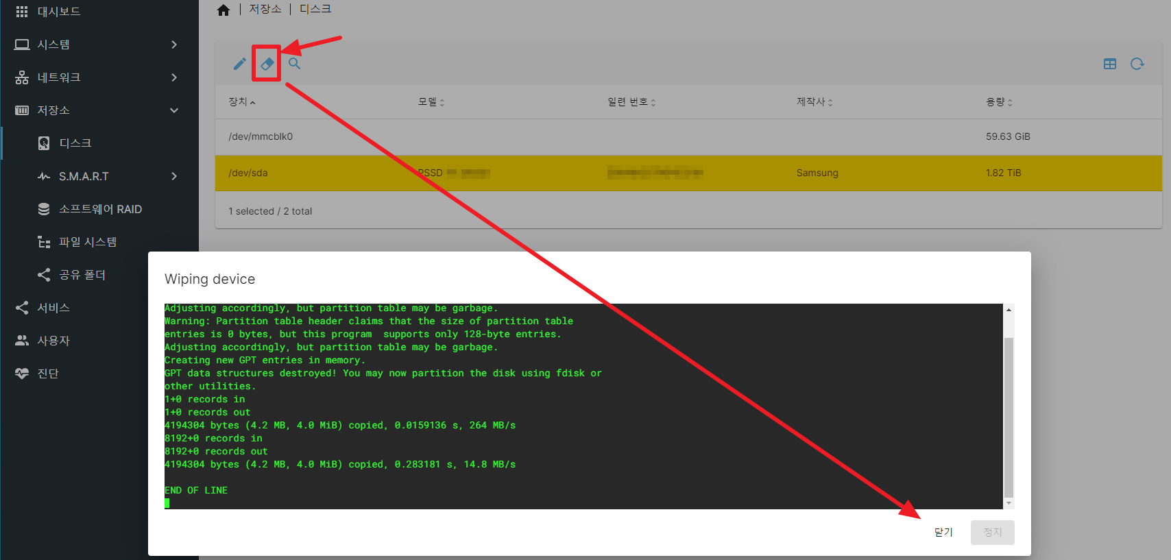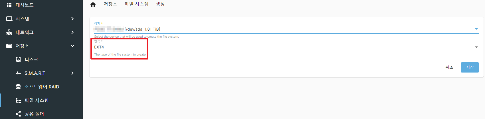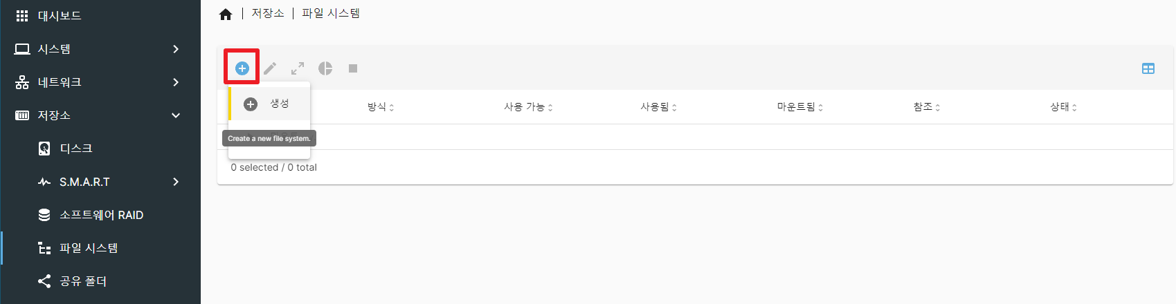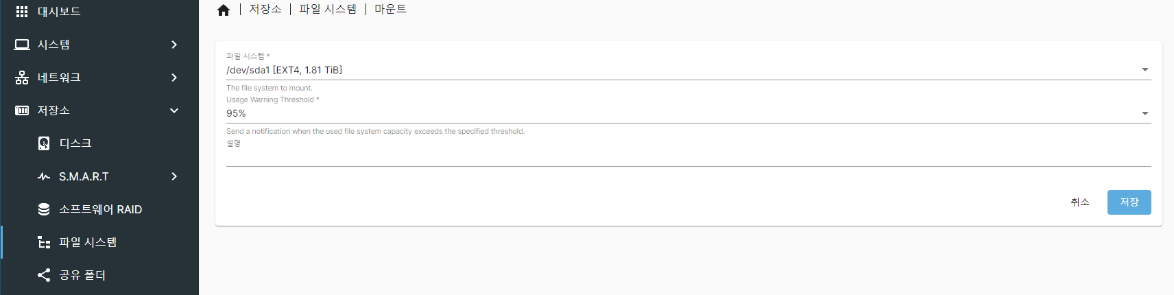 우측 메뉴에서 " 저장소 → 파일 시스템 → 마운트 해제 "