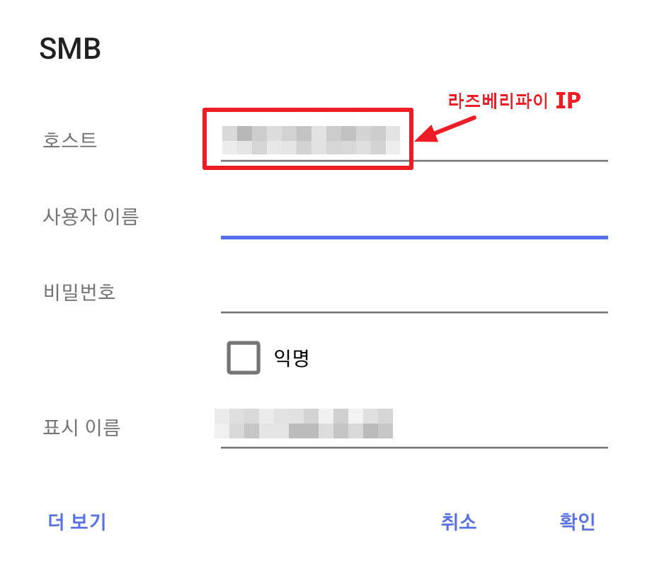 호스트에는 라즈베리파이 IP를 입력하고,
