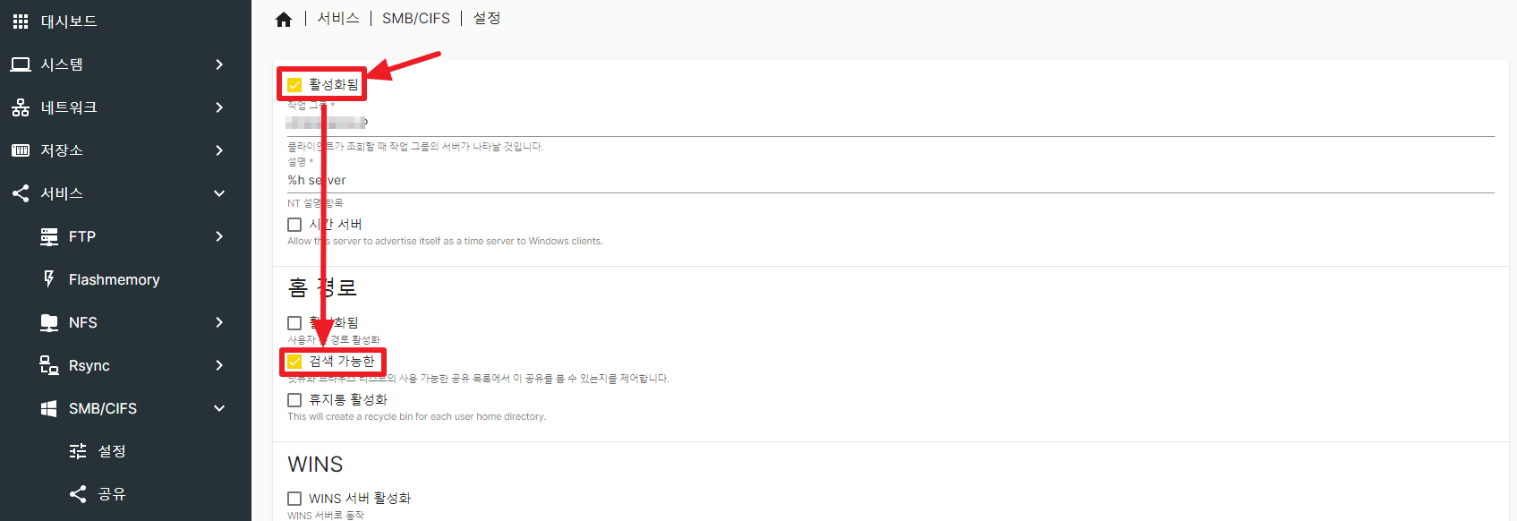 " 서비스 → SMB/CIFS → 설정 → 활성화됨 "