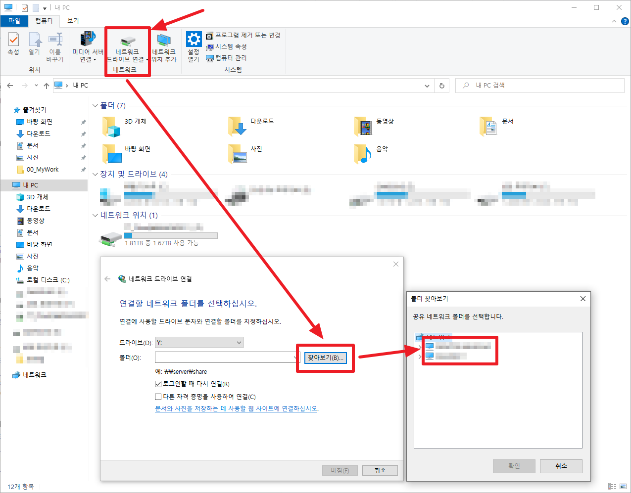 " 내 PC → 네트워크 드라이브 연결 → 찾아보기 → 공유폴더 선책 → 마침 "