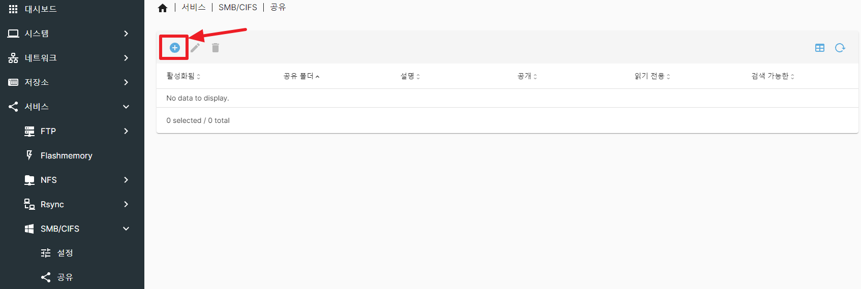 생성했던 공유 폴더를 SMB/CIFS 서비스에 추가한다.