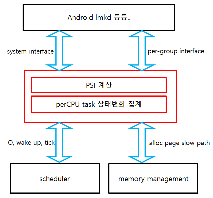 PSI는 2개의 커널 모듈(sched + mm)과 함께 동작하여 정보를 생성한다.