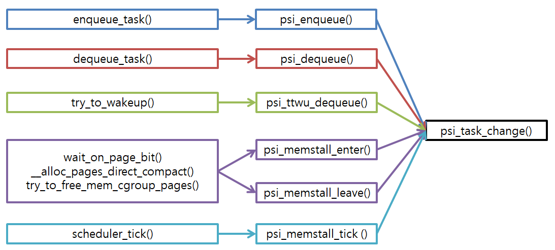 상태 변화를 기록하는 함수는 주로 psi_task_change() 활용하는데, schedule runqueue에 삽입되거나 제거될 때 해당 함수가 호출되게 된다.