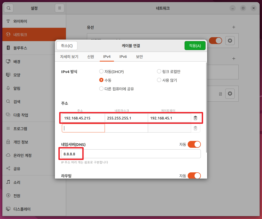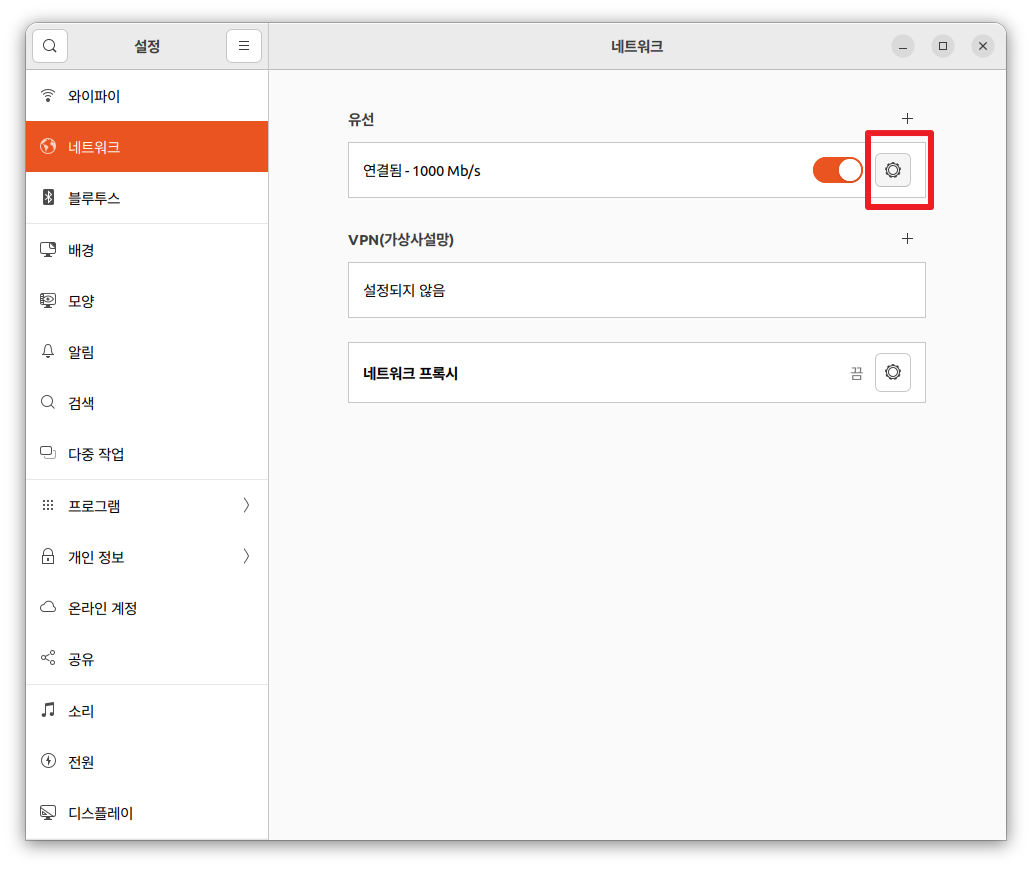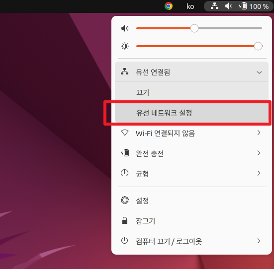 - 우측상단 메뉴에서, '유선 네트워크 설정' 선택