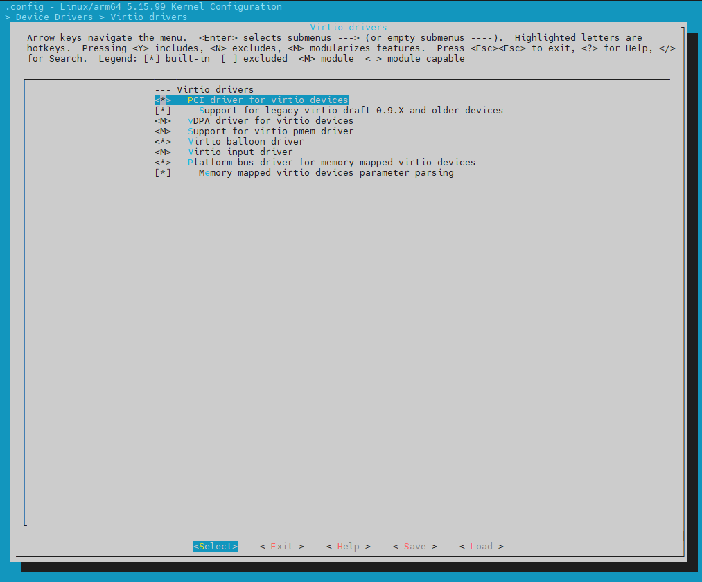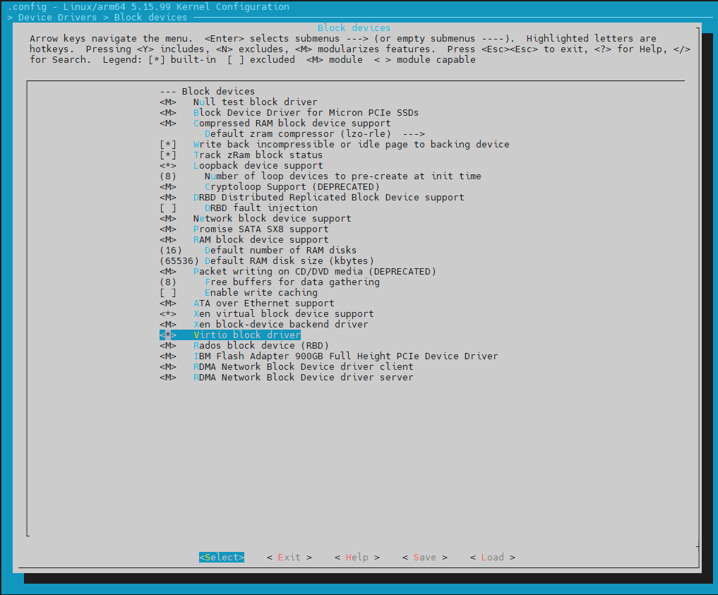 Menu 화면에서 CONFIG_VIRTIO_BLK, CONFIG_VIRTIO_PCI 두개 항목을 활성화