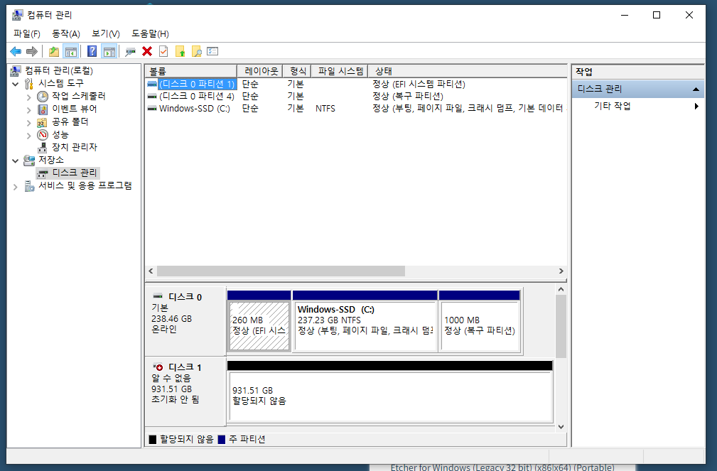 - 윈도우 부팅 후, 컴퓨터 관리 실행 → 디스크 관리