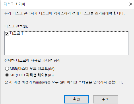 - UEFI BIOS 설치되어 있기 때문에 GPT로 디스크 초기화