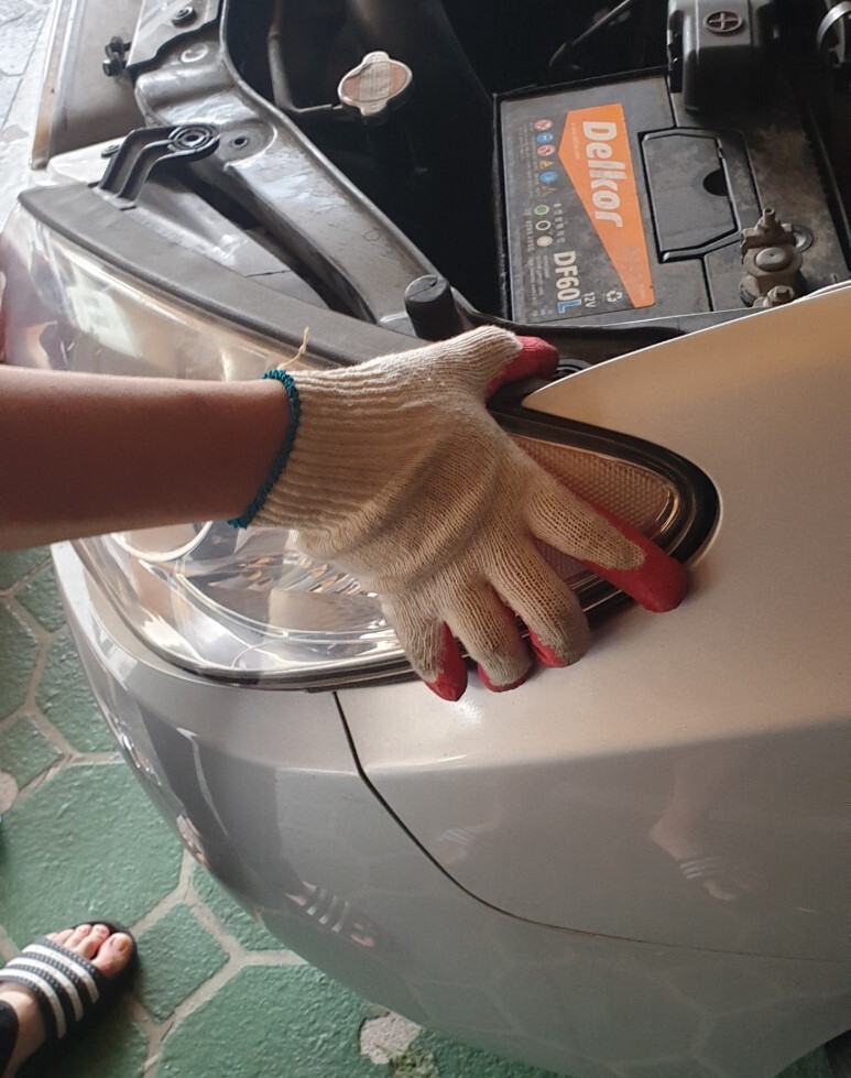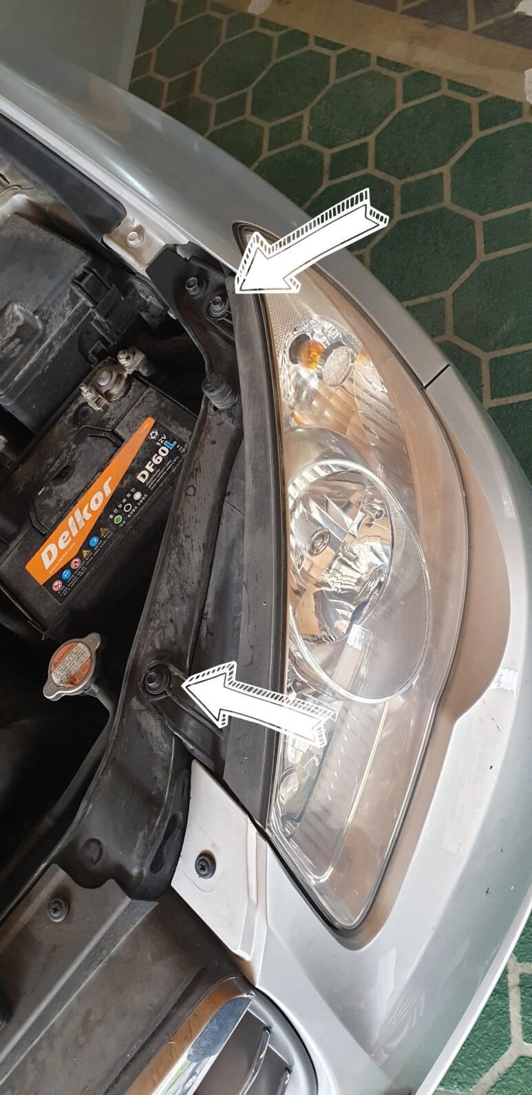 위 사진과 같이, 헤드램프는 후드를 열면 보이는 두 개의 볼트로 고정되어 있다.