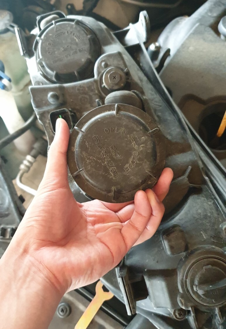 헤드램프의 전조등 전구가 들어가는 뚜껑을 돌려서 제거한다.