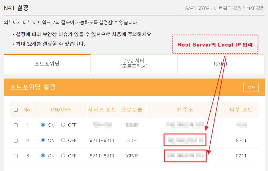 기본으로 설정된 Port 번호 8211 사용하여, 외부에서 접속 가능하도록 Port Forwarding 설정